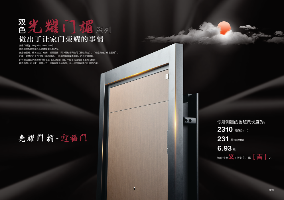 这是一樘有细节的门,如珠宝般,鲜亮的颜色,看不出一点杂质,福熙双色防盗门光滑的表面,看不出一丝破绽,灯光下,泛着光泽,如暗夜中的精灵,让你迷醉。崇尚一种品质,让你感受它的精致!